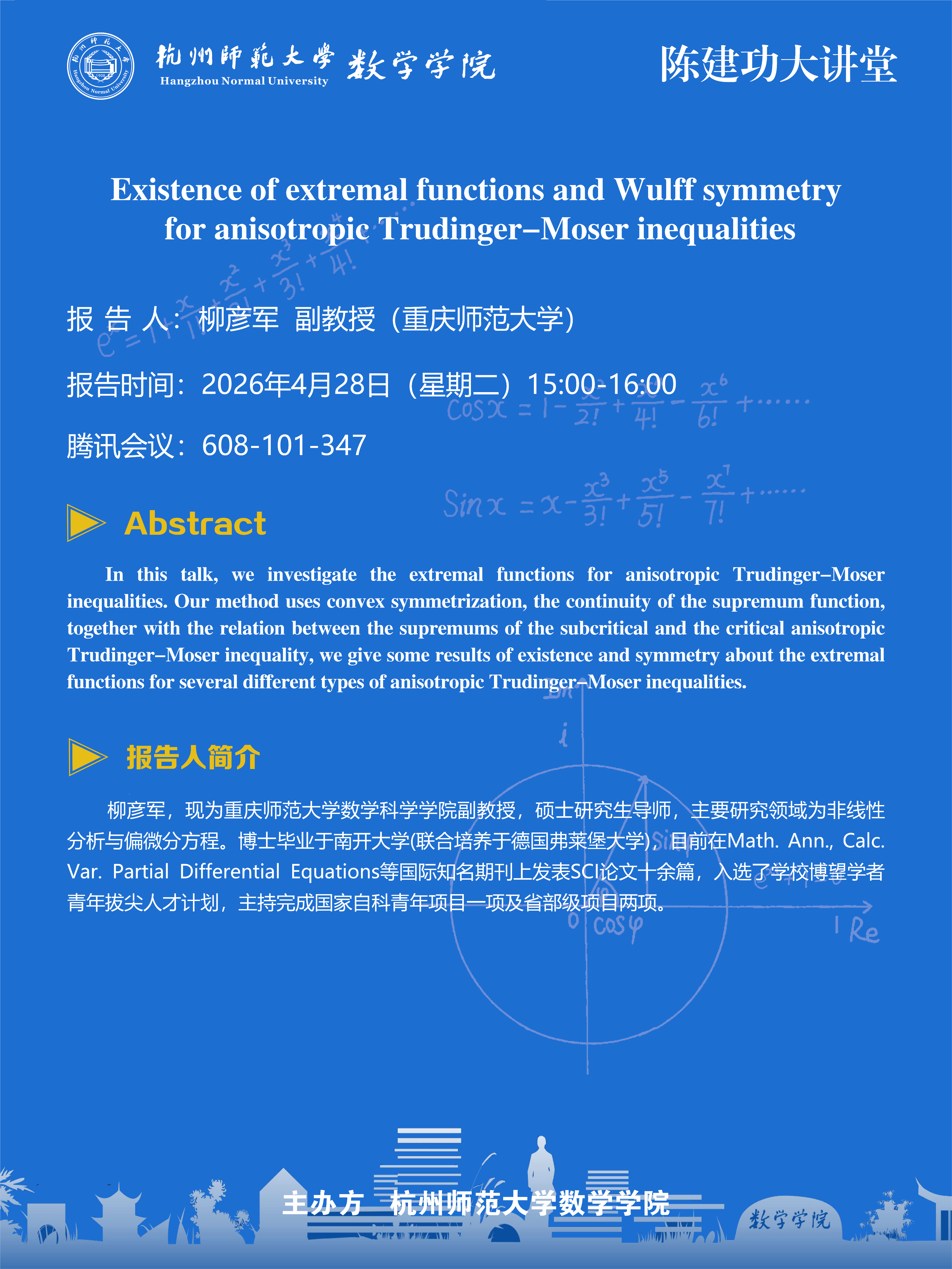 色花堂 大讲堂(2026-21):Existence of extremal functions and Wulff symmetry for anisotropic Trudinger-Moser inequalities